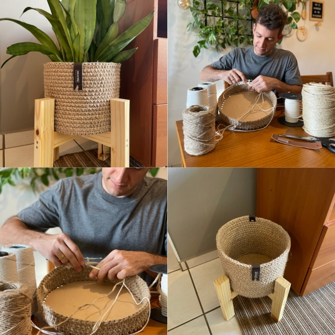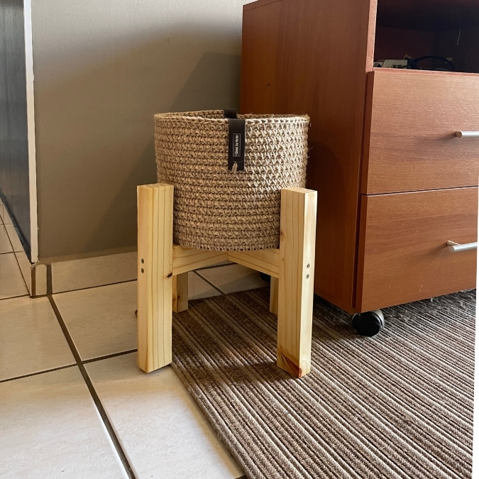 - 1 cachepô para plantas de sisal e juta, 1 suporte de madeira e um brinde surpresa para você usar no dia a dia.